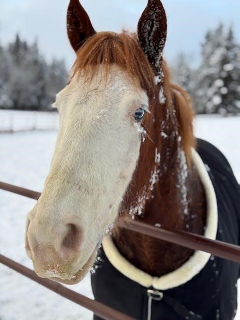 For temperatures below 30°F, a heavyweight blanket is essential to protect your horse from extreme cold; This range poses a higher risk of hypothermia, especially for clipped or senior horses. Heavyweight blankets are designed to provide maximum insulation and are typically filled with high-loft materials; They are ideal for horses living outdoors without access to shelter or for those exposed to harsh winds. Ensure the blanket is waterproof to prevent moisture from penetrating and chilling the horse. Monitor your horse’s comfort, as overheating can occur if the blanket is too heavy for their needs. Adjustments may be necessary, especially during fluctuating temperatures. Proper fitting is crucial to avoid restricting movement and ensure the horse remains warm and comfortable in freezing conditions.